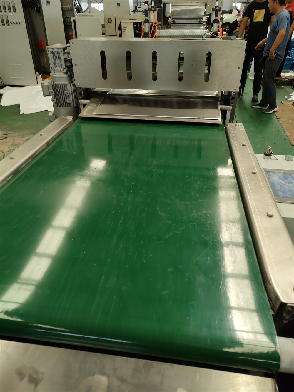 單工位1)上放卷安裝在輸送帶頂部;一個直徑71mm氣脹軸;放卷速度采用磁粉控制; 放卷裝置上安裝2)下放卷安裝與托架下; 一個直徑71mm氣脹軸; 放卷速度采用磁粉控制;下放卷架子與底座為螺絲連接;與輸送帶能同步前后移動;防止下放卷在放無紡布是不能與輥筒摩擦; 放卷裝置上安裝導(dǎo)流輥;展平輥等3)放卷手動糾偏系統(tǒng)二套(七)壓花輥筒一套 1)上輥直徑:150mm,長度:600mm 壓花棍,采用加大氣缸自動調(diào)整高度2)下輥直徑:150mm,長度:600mm 光棍,采用變頻器控制;電機功率:2.2KW(八)JDL-600切刀系統(tǒng)(公司發(fā)明專利:CN201710425661.2)1) 最大剪板寬度:600mm.裁切精度要求控制:0.1mm,最大厚度:15mm,剪切速度,15m/min2) 剪板方式氣動;跟蹤裁斷,跟蹤長度100mm,切刀有光電安全保護裝置,切刀上加羊毛刷;3)要求切刀系統(tǒng)要自動點數(shù);點數(shù)后輸送帶自動分離隔開(例如:每切10次;輸送帶就快一次)4) 輸送帶材質(zhì):輸送帶600mm×1500mm;輸送帶里面加不銹鋼板鋪平,橡膠輸送帶兩邊要帶槽道;防止輸送帶跑偏;輸送帶兩邊要包邊